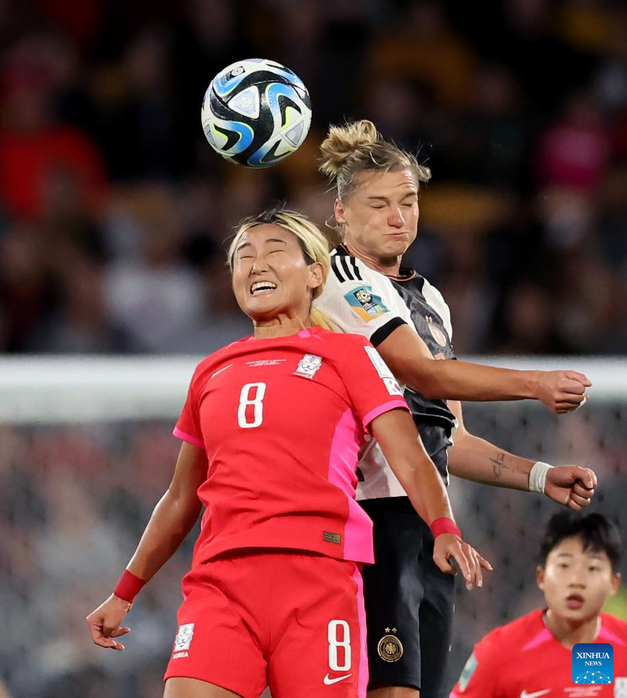 Cho Sohyun (L) of South Korea vies with Alexandra Popp of Germany for a header during the Group H match between South Korea and Germany at the 2023 FIFA Women's World Cup in Brisbane, Australia, Aug. 3, 2023. (Xinhua/Zhang Chen)