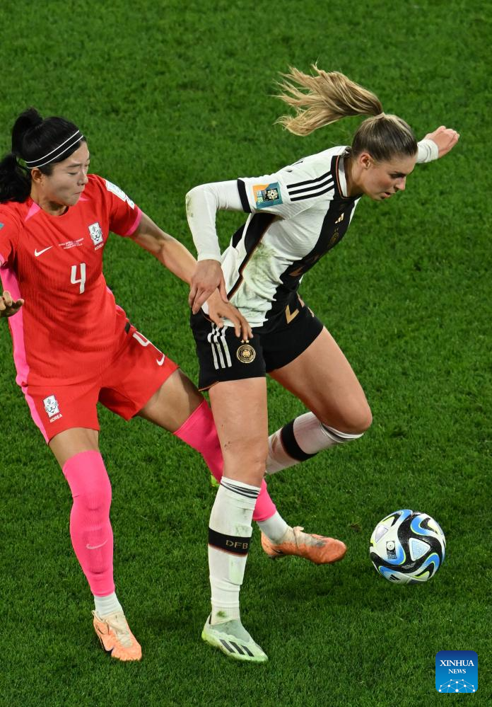 Jule Brand (R) of Germany vies with Shim Seoyeon of South Korea during the Group H match between South Korea and Germany at the 2023 FIFA Women's World Cup in Brisbane, Australia, Aug. 3, 2023. (Xinhua/Li Yibo)