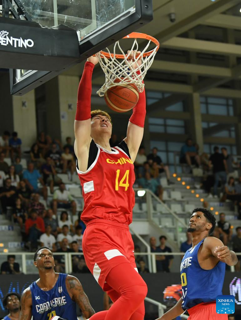 Wang Zhelin (top) of China slams dunk during the Trentino Cup basketball match between China and Cape Verde, in Trento, Italy, Aug. 4, 2023. (Xinhua/Jin Mamengni)