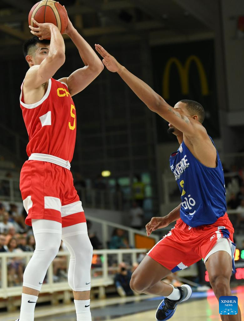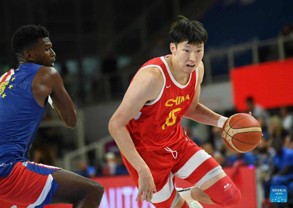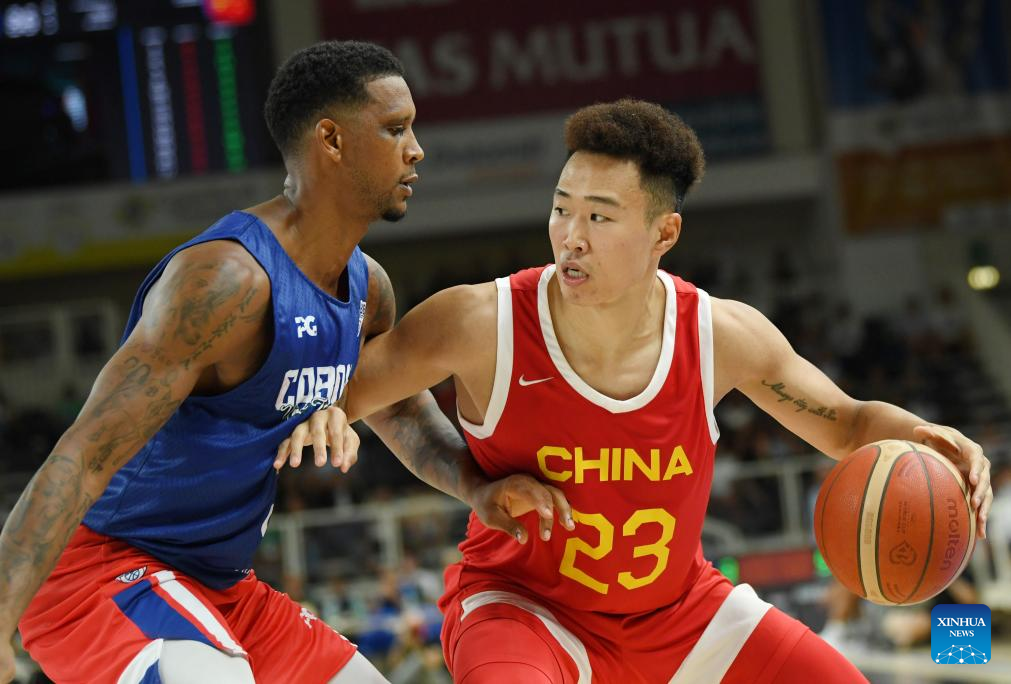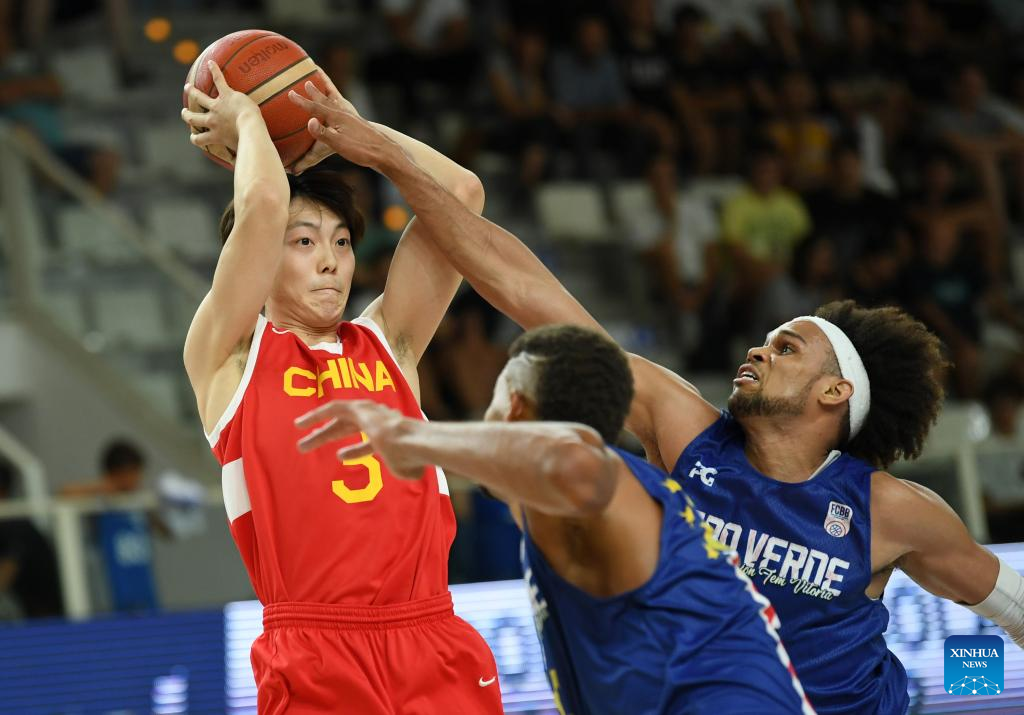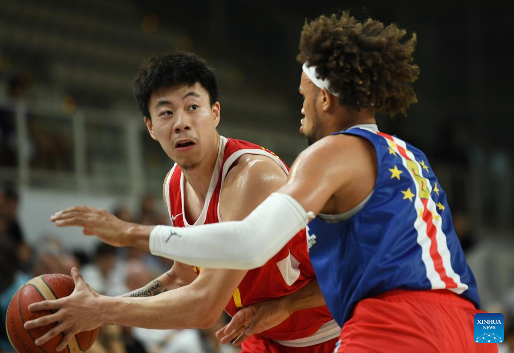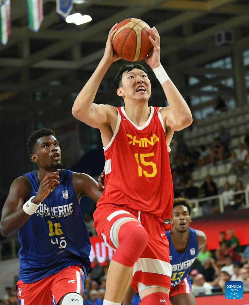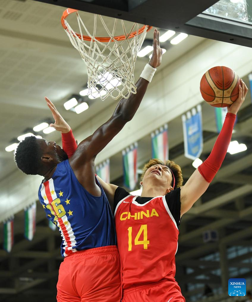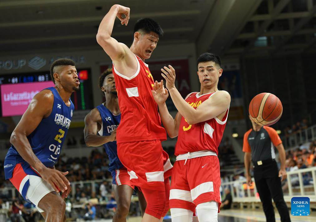 Zhang Zhenlin (L) of China competes during the Trentino Cup basketball match between China and Cape Verde, in Trento, Italy, Aug. 4, 2023. (Xinhua/Jin Mamengni)