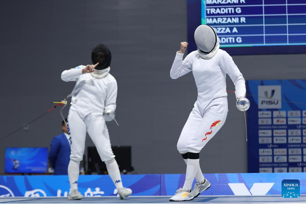 China's Tang Junyao (R) competes against Italy's Gaia Traditi during the fencing women's epee team gold medal match at the 31st FISU Summer World University Games in Chengdu, southwest China's Sichuan Province, Aug. 5, 2023. (Xinhua/Qi Xiaoyi)