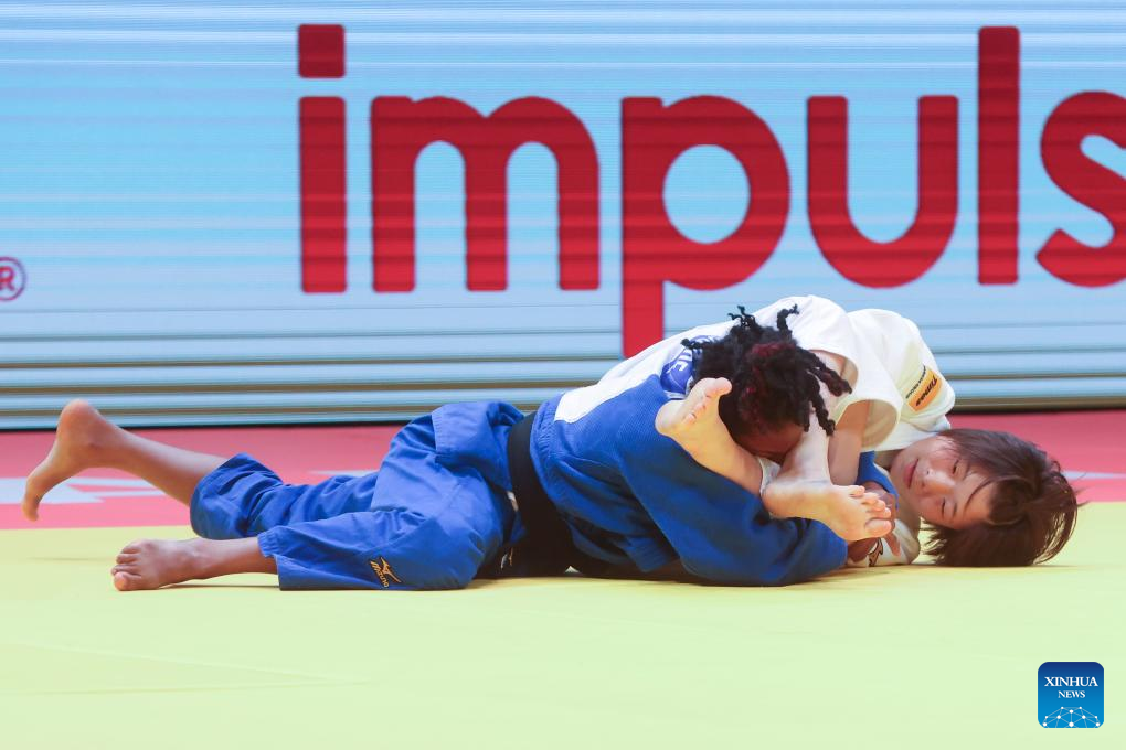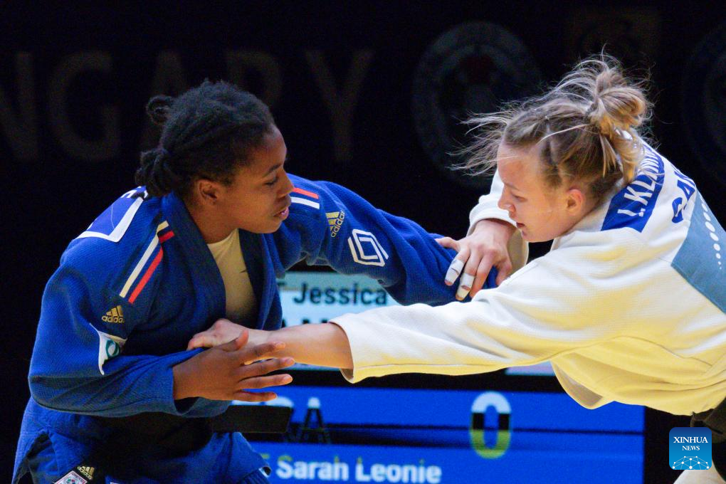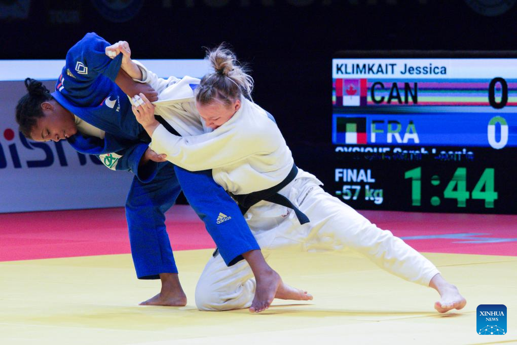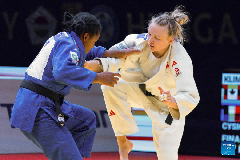 Jessica Klimkait (R) of Canada competes with Sarah Leonie Cysique of France during the women's -57kg final at the Judo Hungary Masters 2023 in Budapest, Hungary on Aug. 4, 2023. (Photo by Attila Volgyi/Xinhua)