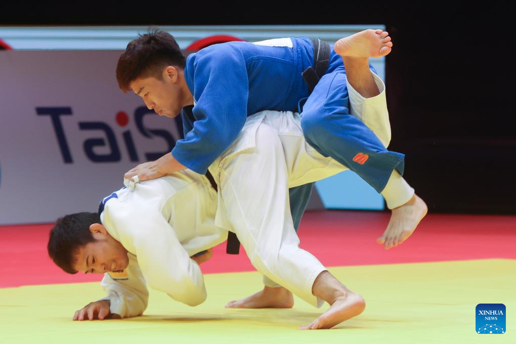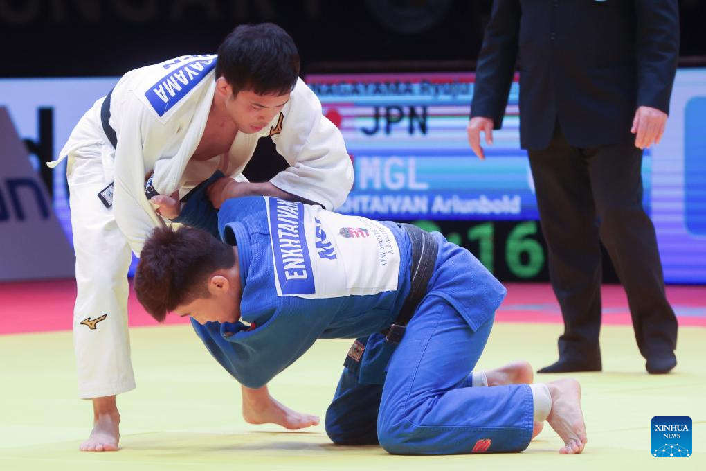Nagayama Ryuju (L) of Japan competes with Ariunbold Enkhtaivan of Mongolia during the men's -60kg final at the Judo Hungary Masters 2023 in Budapest, Hungary on Aug. 4, 2023. (Photo by Attila Volgyi/Xinhua)