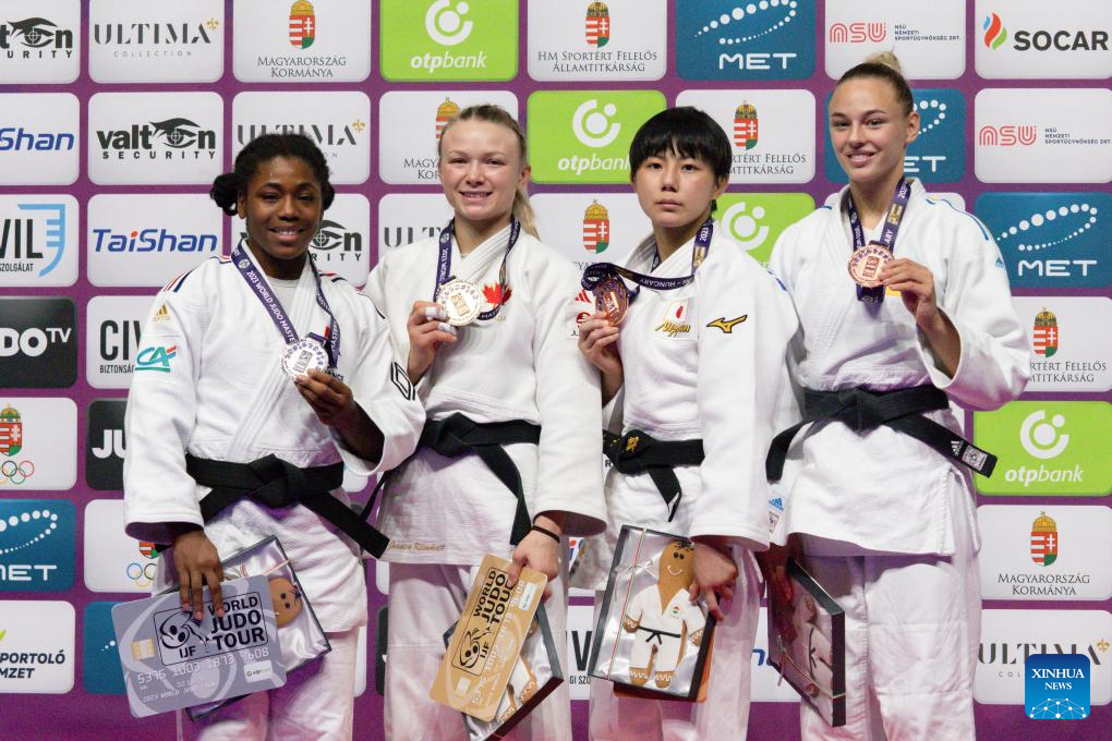 Sarah Leonie Cysique of France, Jessica Klimkait of Canada, Funakubo Haruka of Japan and Daria Bilodid of Ukraine (L to R) pose during the medal ceremony for women's -57kg at the Judo Hungary Masters 2023 in Budapest, Hungary on Aug. 4, 2023. (Photo by Attila Volgyi/Xinhua)