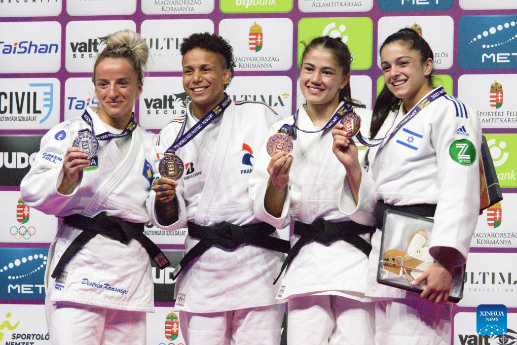 Distria Krasniqi of Kosovo, Amandine Buchard of France, Diyora Keldiyorova of Uzbekistan and Gefen Primo of Israel (L to R) react during the medal ceremony for women's -52kg at the Judo Hungary Masters 2023 in Budapest, Hungary on Aug. 4, 2023. (Photo by Attila Volgyi/Xinhua)
