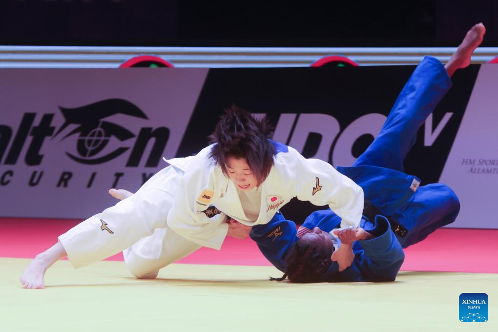 Koga Wakana (L) of Japan competes with Maria Celia Laborde of the United States during the women's -48kg final at the Judo Hungary Masters 2023 in Budapest, Hungary on Aug. 4, 2023. (Photo by Attila Volgyi/Xinhua)