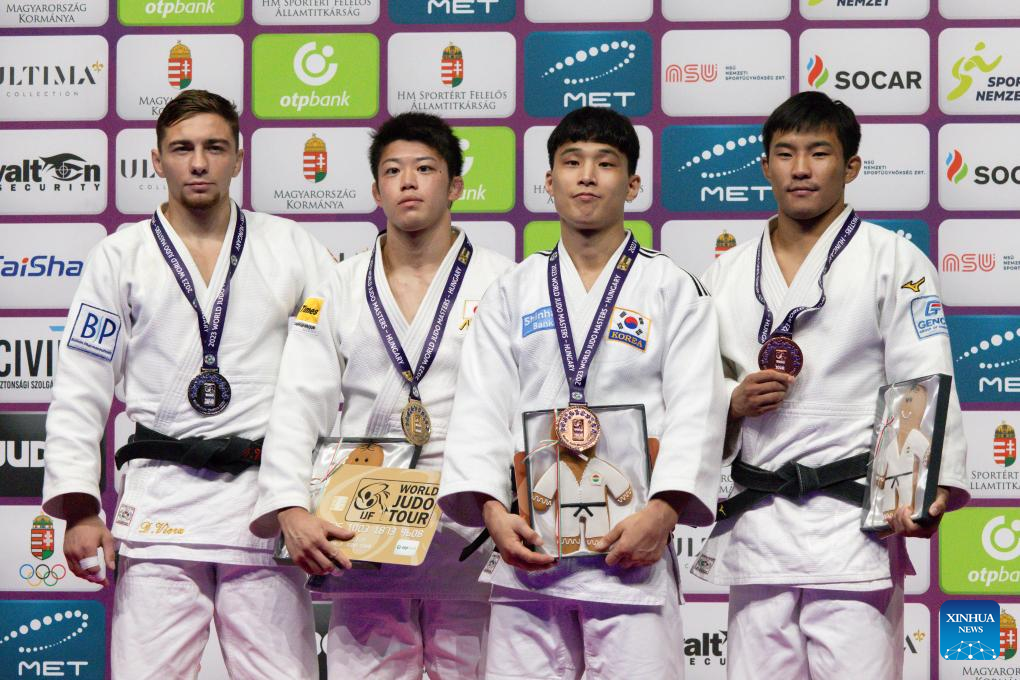 Denis Vieru of Moldova, Tanaka Ryoma of Japan, An Baul of South Korea and Narmandakh Bayanmunkh of United Arab Emirates (L to R) react during the medal ceremony for men's -66kg at the Judo Hungary Masters 2023 in Budapest, Hungary on Aug. 4, 2023. (Photo by Attila Volgyi/Xinhua)