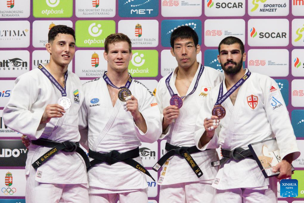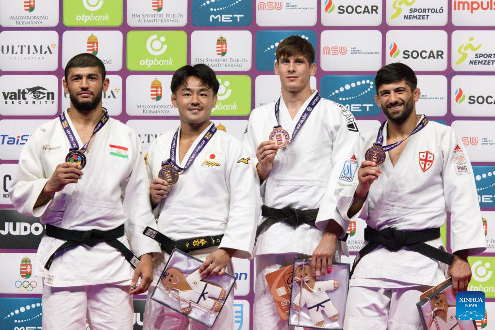 Behruzi Khojazoda of Tajikistan, Hashimoto Soichi of Japan, Petru Pelivan of Moldova and Lasha Shavdatuashvili of Georgia (L to R) pose during the medal ceremony for men's -73kg at the Judo Hungary Masters 2023 in Budapest, Hungary on Aug. 5, 2023. (Photo by Attila Volgyi/Xinhua)