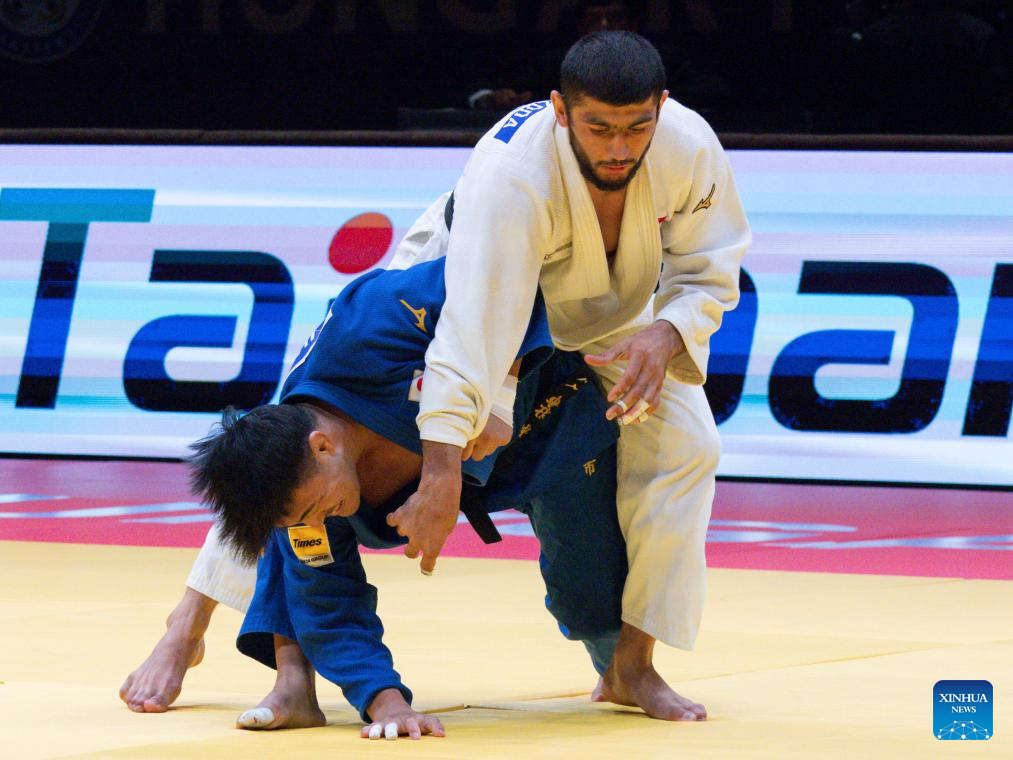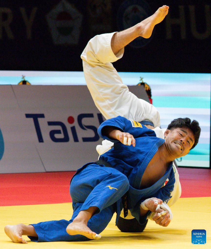 Hashimoto Soichi (L) of Japan competes with Behruzi Khojazoda of Tajikistan during the men's -73kg final at the Judo Hungary Masters 2023 in Budapest, Hungary on Aug. 5, 2023. (Photo by Attila Volgyi/Xinhua)