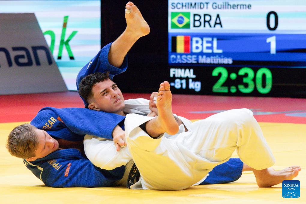 Matthias Casse (R) of Belgium competes with Guilherme Schimidt of Brazil during the men's -81kg final at the Judo Hungary Masters 2023 in Budapest, Hungary on Aug. 5, 2023. (Photo by Attila Volgyi/Xinhua)