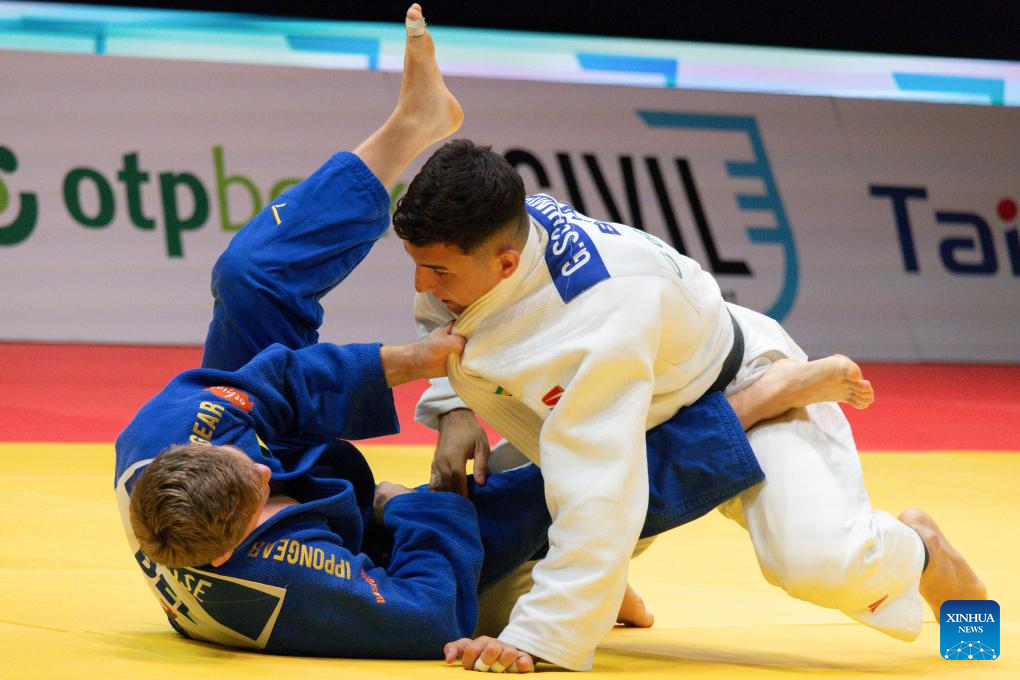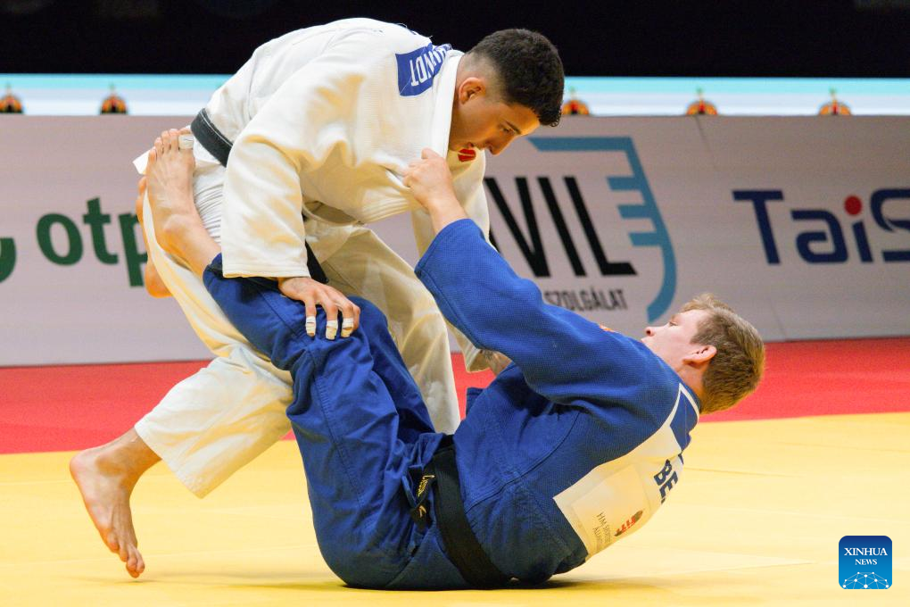 Matthias Casse (L) of Belgium competes with Guilherme Schimidt of Brazil during the men's -81kg final at the Judo Hungary Masters 2023 in Budapest, Hungary on Aug. 5, 2023. (Photo by Attila Volgyi/Xinhua)