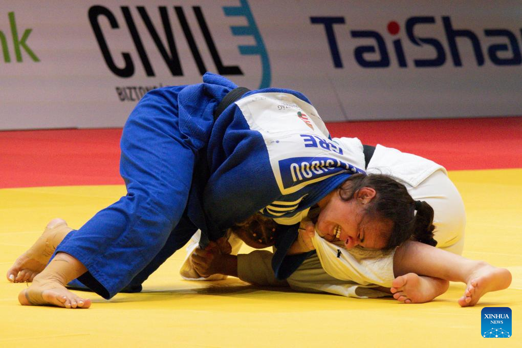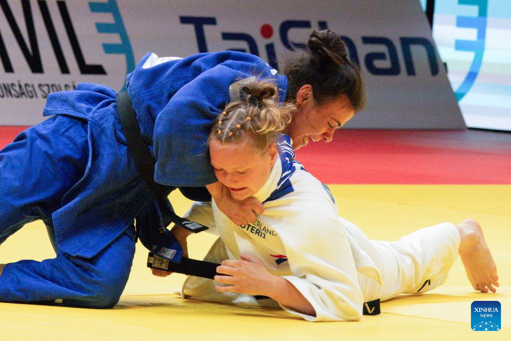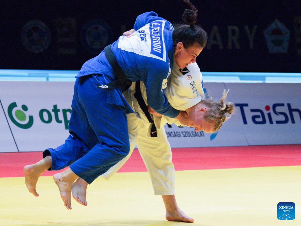 Sanne Van Dijke (R) of the Netherlands competes with Elisavet Teltsidou of Greece during the women's -70kg final at the Judo Hungary Masters 2023 in Budapest, Hungary on Aug. 5, 2023. (Photo by Attila Volgyi/Xinhua)