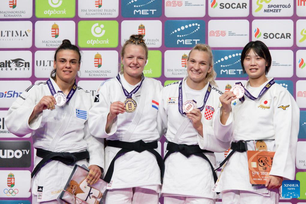 Elisavet Teltsidou of Greece, Sanne Van Dijke of the Netherlands, Lara Cvjetko of Croatia and Niizoe Saki of Japan (L to R) react during the medal ceremony for women's -70kg at the Judo Hungary Masters 2023 in Budapest, Hungary on Aug. 5, 2023. (Photo by Attila Volgyi/Xinhua)