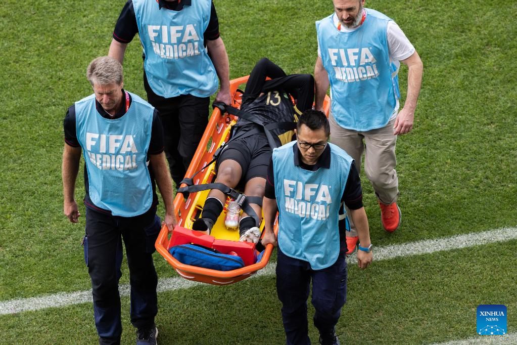 Bambanani Nolufefe Mbane (C) of South Africa is carried off during the round of 16 match between the Netherlands and South Africa at the 2023 FIFA Women's World Cup in Sydney, Australia, Aug. 6, 2023. (Photo by Hu Jingchen/Xinhua)