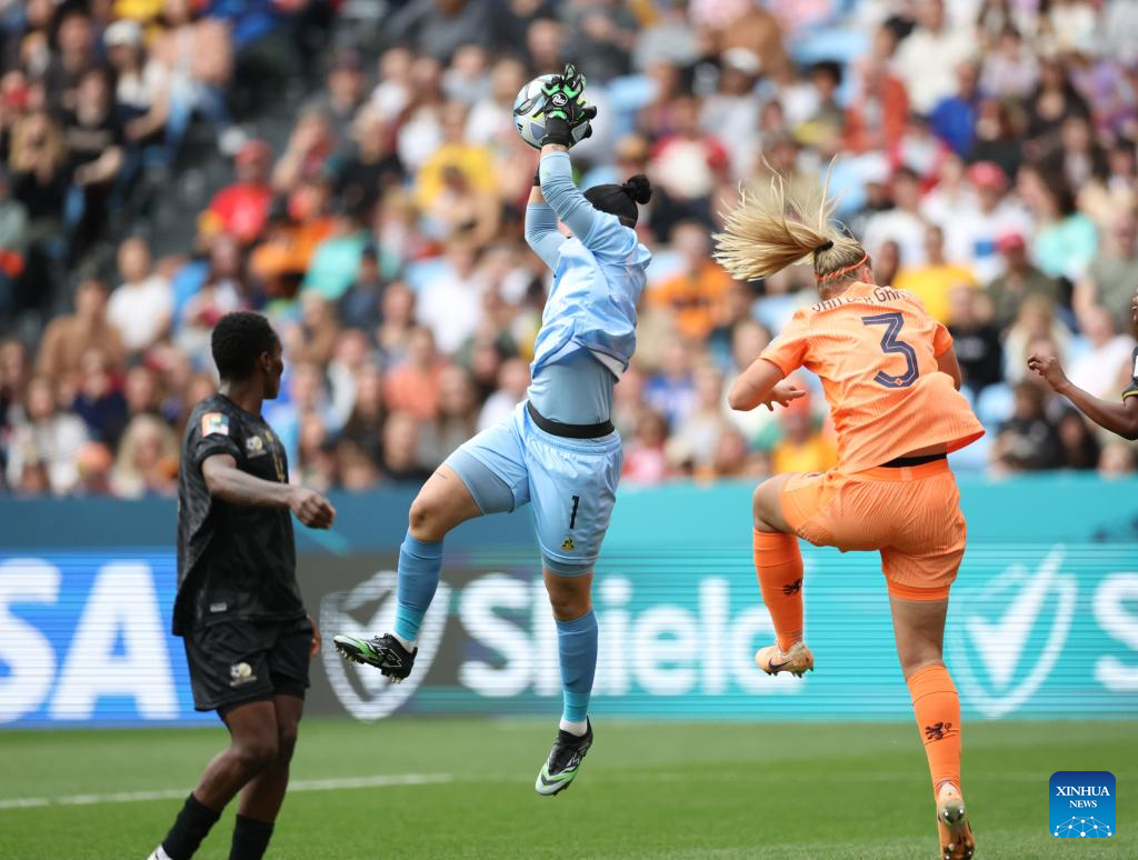 Goalkeeper Daphne Van Domselaar (2nd L) of the Netherlands makes a save during the round of 16 match between the Netherlands and South Africa at the 2023 FIFA Women's World Cup in Sydney, Australia, Aug. 6, 2023. (Xinhua/Bai Xuefei)
