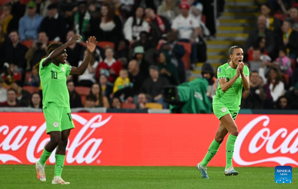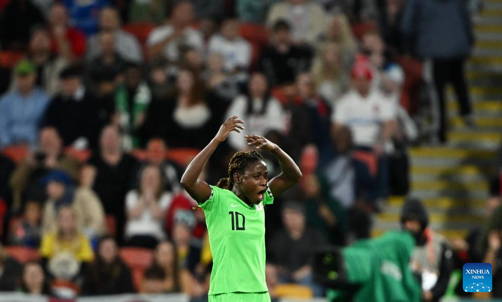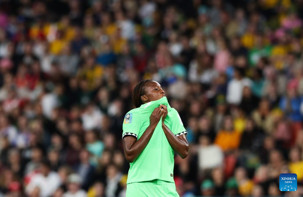 Nigeria's Christy Ucheibe reacts during the round of 16 match between England and Nigeria at the 2023 FIFA Women's World Cup in Brisbane, Australia, Aug. 7, 2023. (Xinhua/Li Yibo)