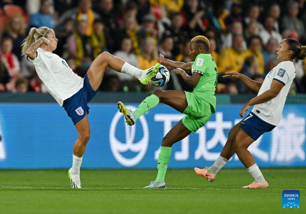 England's Rachel Daly (L) vies with Nigeria's Halimatu Ayinde (C) during the round of 16 match between England and Nigeria at the 2023 FIFA Women's World Cup in Brisbane, Australia, Aug. 7, 2023. (Xinhua/Li Yibo)
