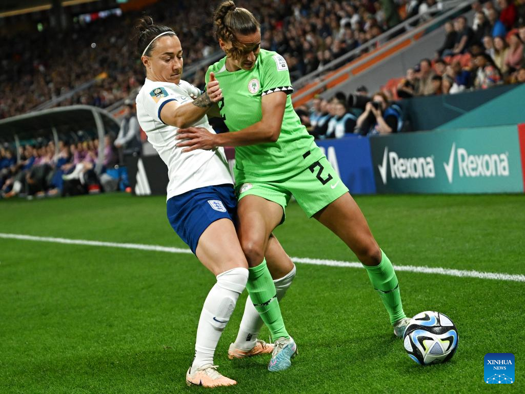 Nigeria's Ashleigh Plumptre (R) vies with England's Lucy Bronze during the round of 16 match between England and Nigeria at the 2023 FIFA Women's World Cup in Brisbane, Australia, Aug. 7, 2023. (Xinhua/Li Yibo)