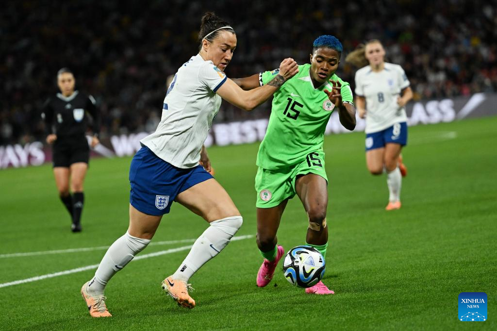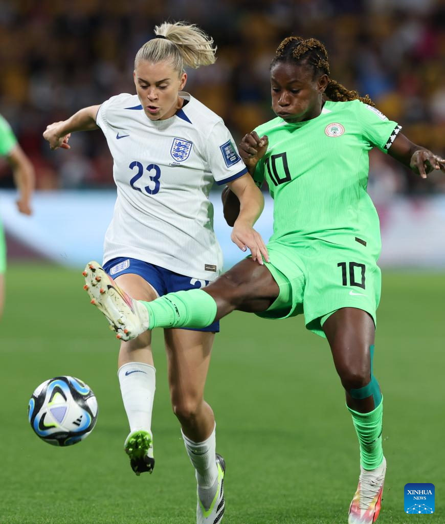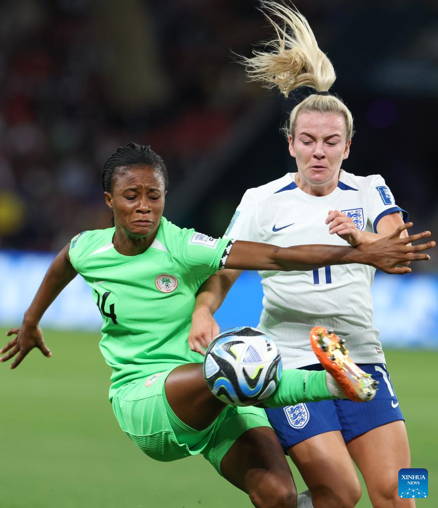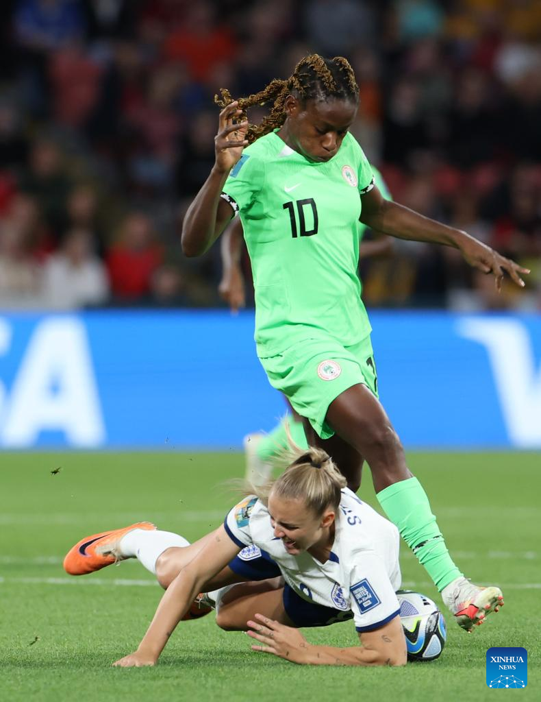 Nigeria's Christy Ucheibeu (L) vies for the ball during the round of 16 match between England and Nigeria at the 2023 FIFA Women's World Cup in Brisbane, Australia, Aug. 7, 2023. (Xinhua/Li Yibo)