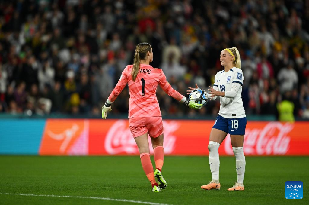 England's goalkeeper Mary Earps (L) talks to teammate Chloe Kelly during the penalty shootout of the round of 16 match between England and Nigeria at the 2023 FIFA Women's World Cup in Brisbane, Australia, Aug. 7, 2023. (Xinhua/Li Yibo)