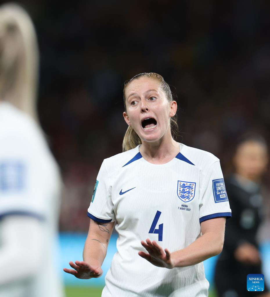 England's Keira Walsh gestures during the round of 16 match between England and Nigeria at the 2023 FIFA Women's World Cup in Brisbane, Australia, Aug. 7, 2023. (Xinhua/Ding Ting)