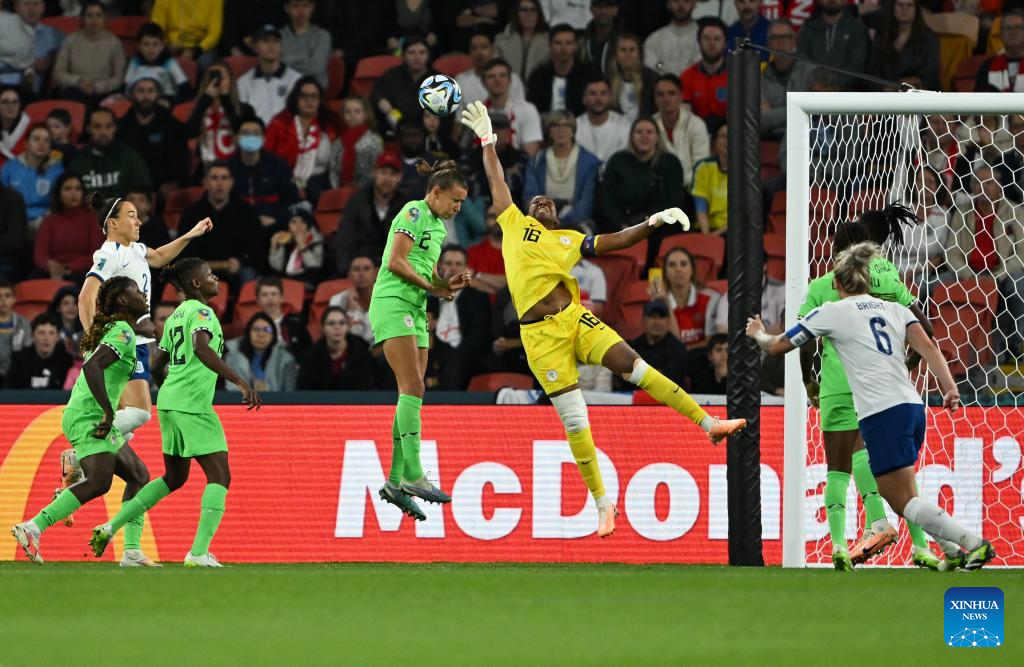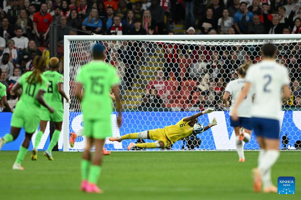 Nigeria's goalkeeper Chiamaka Nnadozie (3rd R) makes a save during the round of 16 match between England and Nigeria at the 2023 FIFA Women's World Cup in Brisbane, Australia, Aug. 7, 2023. (Xinhua/Li Yibo)