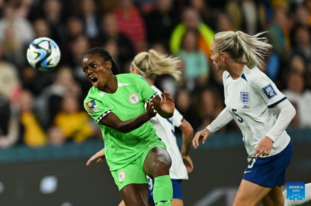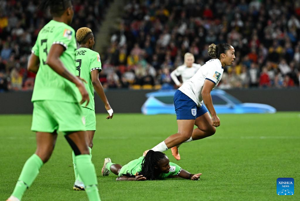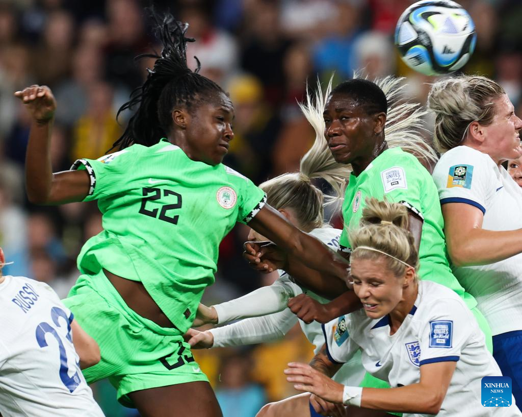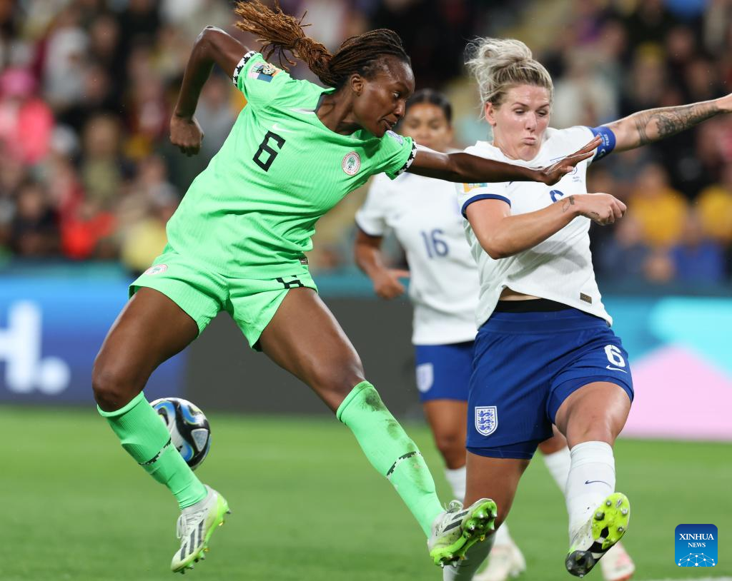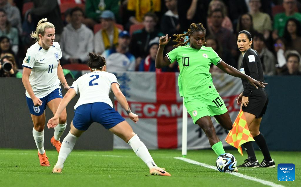 Nigeria's Christy Ucheibeu (2nd R) competes during the round of 16 match between England and Nigeria at the 2023 FIFA Women's World Cup in Brisbane, Australia, Aug. 7, 2023. (Xinhua/Li Yibo)