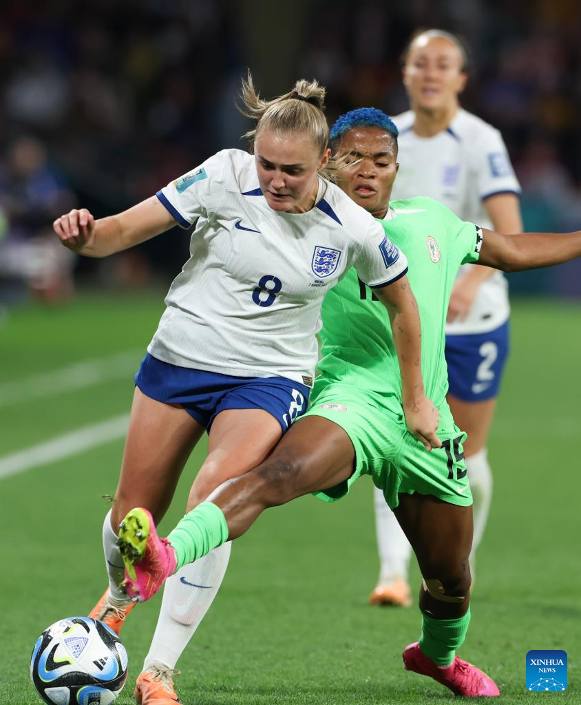 England's Lauren Hemp (L) vies with Nigeria's Blessing Demehin during the round of 16 match between England and Nigeria at the 2023 FIFA Women's World Cup in Brisbane, Australia, Aug. 7, 2023. (Xinhua/Ding Ting)