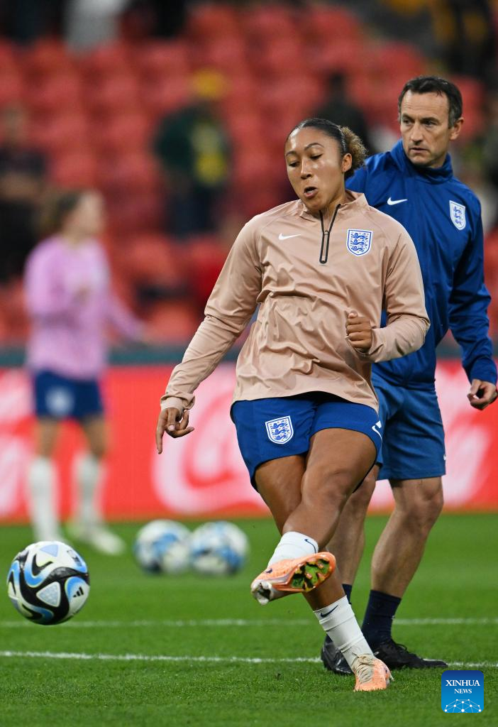 England's Lauren James (front) warms up before the round of 16 match between England and Nigeria at the 2023 FIFA Women's World Cup in Brisbane, Australia, Aug. 7, 2023. (Xinhua/Li Yibo)