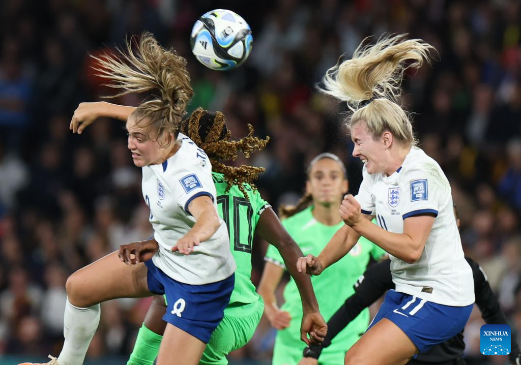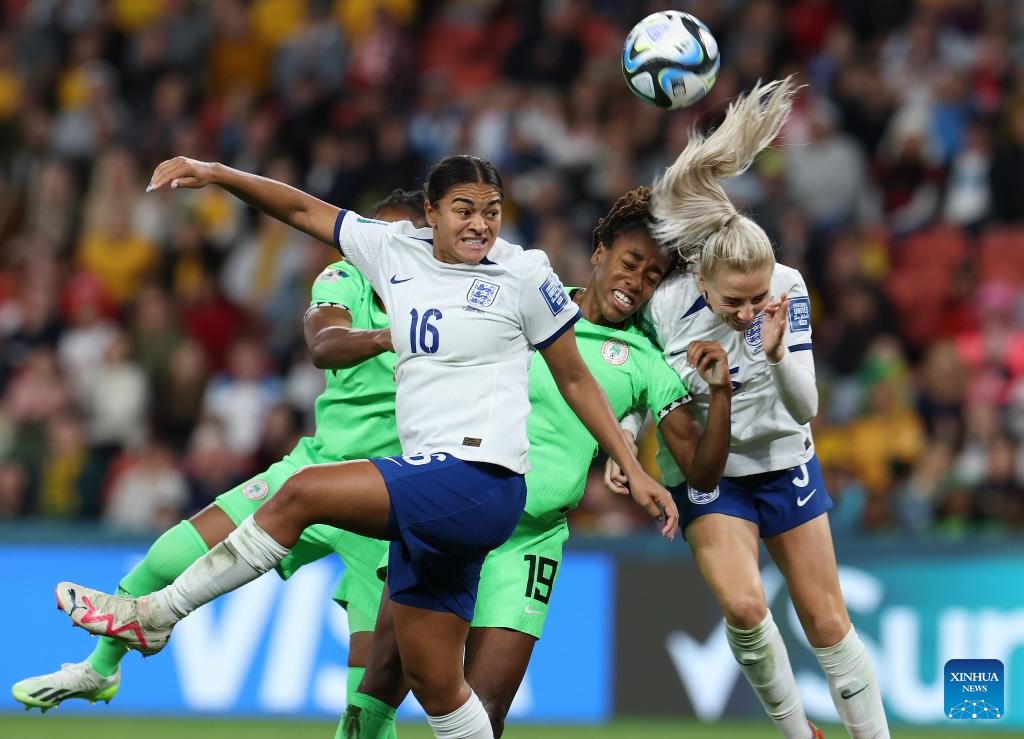 England's Georgia Stanway (1st L) vies for a header during the round of 16 match between England and Nigeria at the 2023 FIFA Women's World Cup in Brisbane, Australia, Aug. 7, 2023. (Xinhua/Ding Ting)