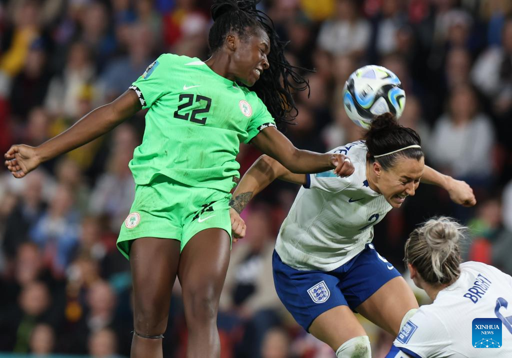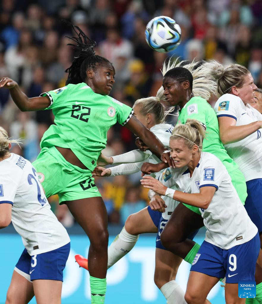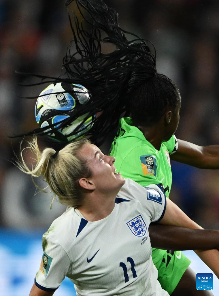 Nigeria's Asisat Oshoala (2nd R) vies for a header during the round of 16 match between England and Nigeria at the 2023 FIFA Women's World Cup in Brisbane, Australia, Aug. 7, 2023. (Xinhua/Ding Ting)