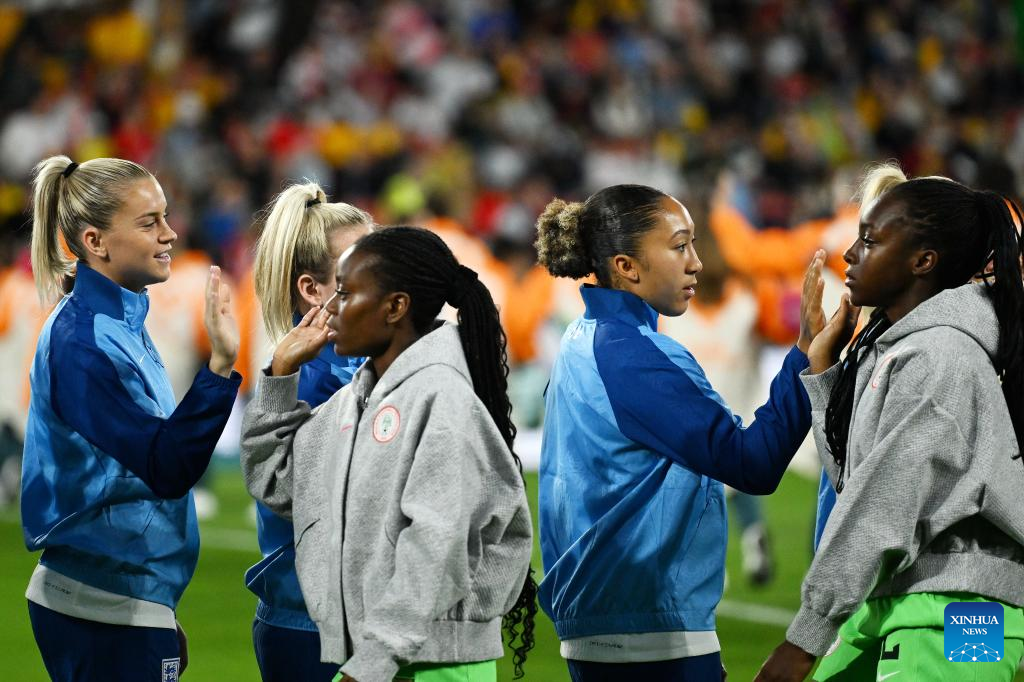 Players of both teams clap hands before the round of 16 match between England and Nigeria at the 2023 FIFA Women's World Cup in Brisbane, Australia, Aug. 7, 2023. (Xinhua/Li Yibo)