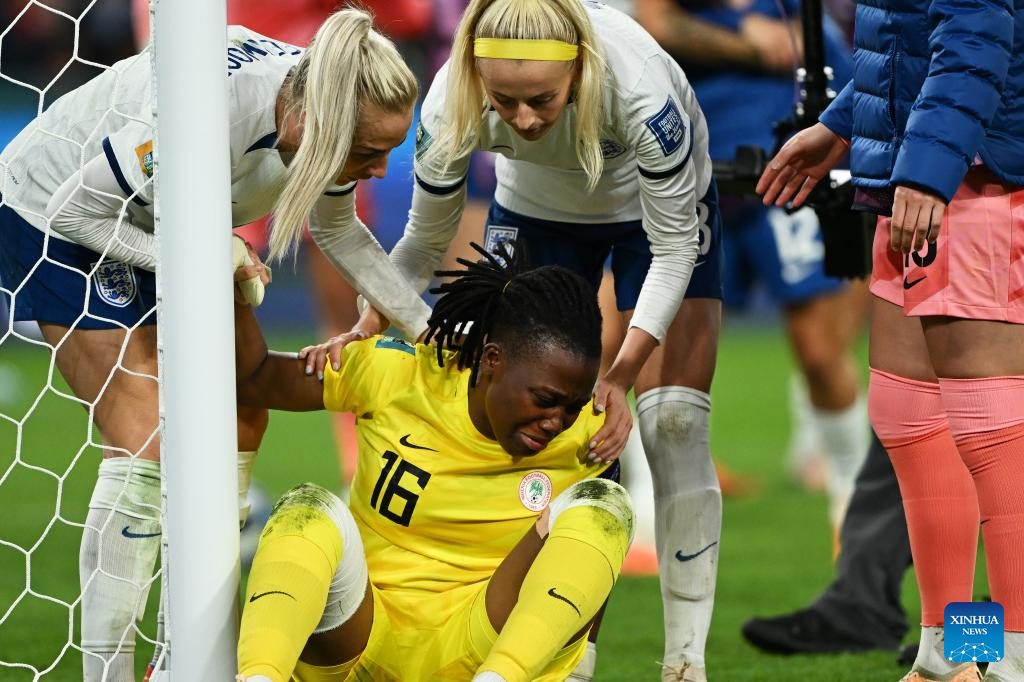 Nigeria's goalkeeper Chiamaka Nnadozie (bottom) reacts after the round of 16 match between England and Nigeria at the 2023 FIFA Women's World Cup in Brisbane, Australia, Aug. 7, 2023. (Xinhua/Li Yibo)