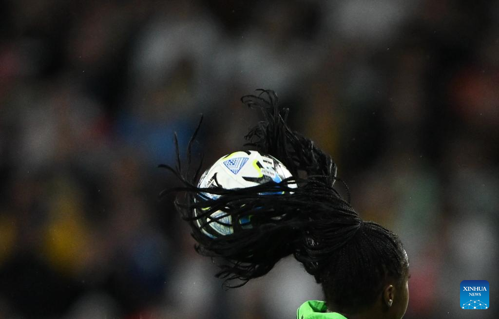 Nigeria's Michelle Alozie (C) heads the ball during the round of 16 match between England and Nigeria at the 2023 FIFA Women's World Cup in Brisbane, Australia, Aug. 7, 2023. (Xinhua/Ding Ting)