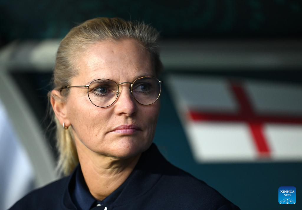 Head coach Sarina Wiegman of England looks on before the round of 16 match between England and Nigeria at the 2023 FIFA Women's World Cup in Brisbane, Australia, Aug. 7, 2023. (Xinhua/Li Yibo)