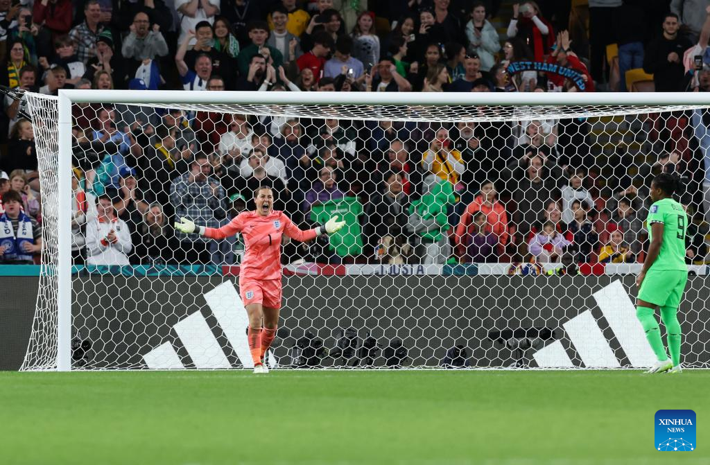 England's goalkeeper Mary Earps (L) celebrates during the penalty shootout of the round of 16 match between England and Nigeria at the 2023 FIFA Women's World Cup in Brisbane, Australia, Aug. 7, 2023. (Xinhua/Ding Ting)