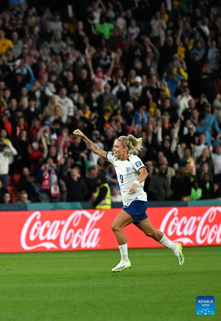 England's Rachel Daly celebrates winning the penalty shootout of the round of 16 match between England and Nigeria at the 2023 FIFA Women's World Cup in Brisbane, Australia, Aug. 7, 2023. (Xinhua/Li Yibo)