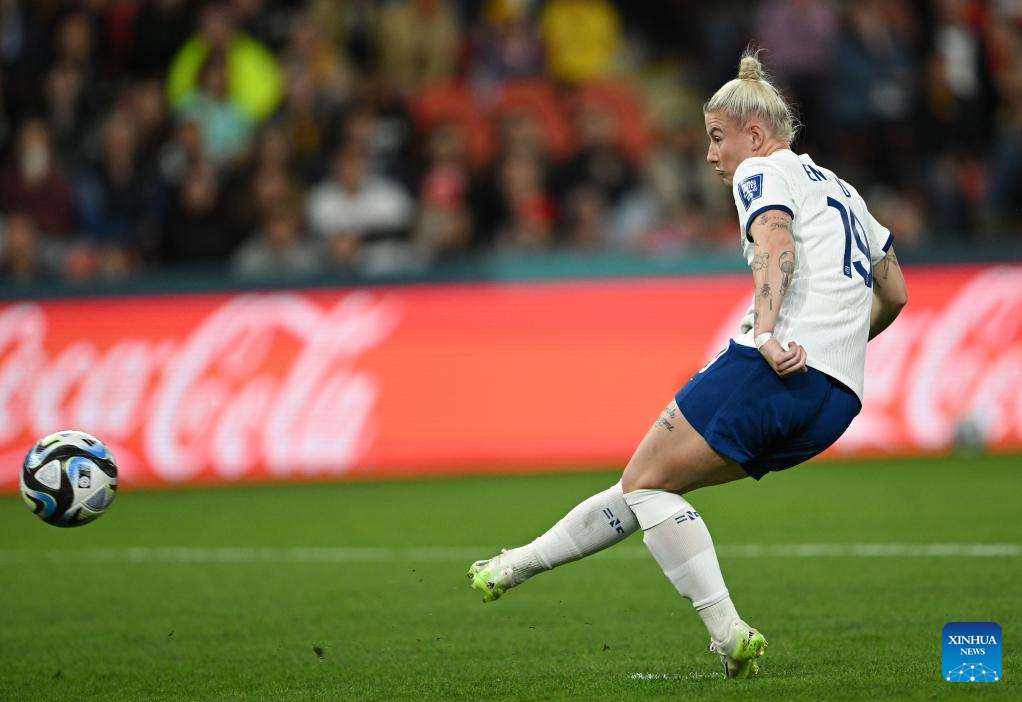 England's Beth England shoots during the penalty shootout of the round of 16 match between England and Nigeria at the 2023 FIFA Women's World Cup in Brisbane, Australia, Aug. 7, 2023. (Xinhua/Li Yibo)