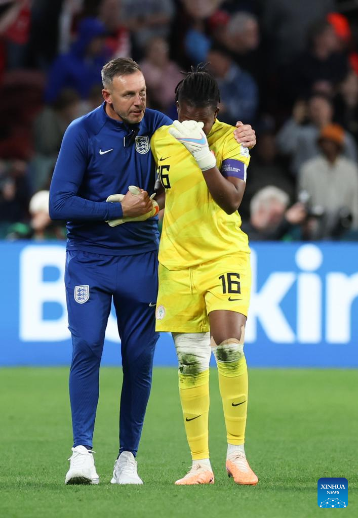 Nigeria's goalkeeper Chiamaka Nnadozie (R) reacts after the round of 16 match between England and Nigeria at the 2023 FIFA Women's World Cup in Brisbane, Australia, Aug. 7, 2023. (Xinhua/Ding Ting)