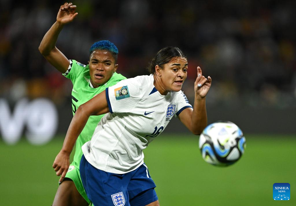 Nigeria's Michelle Alozie (R) vies with England's Lauren Hemp during the round of 16 match between England and Nigeria at the 2023 FIFA Women's World Cup in Brisbane, Australia, Aug. 7, 2023. (Xinhua/Li Yibo)