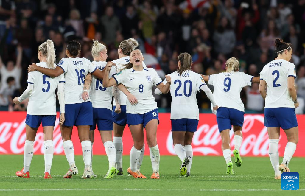 Players of England celebrate after the round of 16 match between England and Nigeria at the 2023 FIFA Women's World Cup in Brisbane, Australia, Aug. 7, 2023. (Xinhua/Ding Ting)