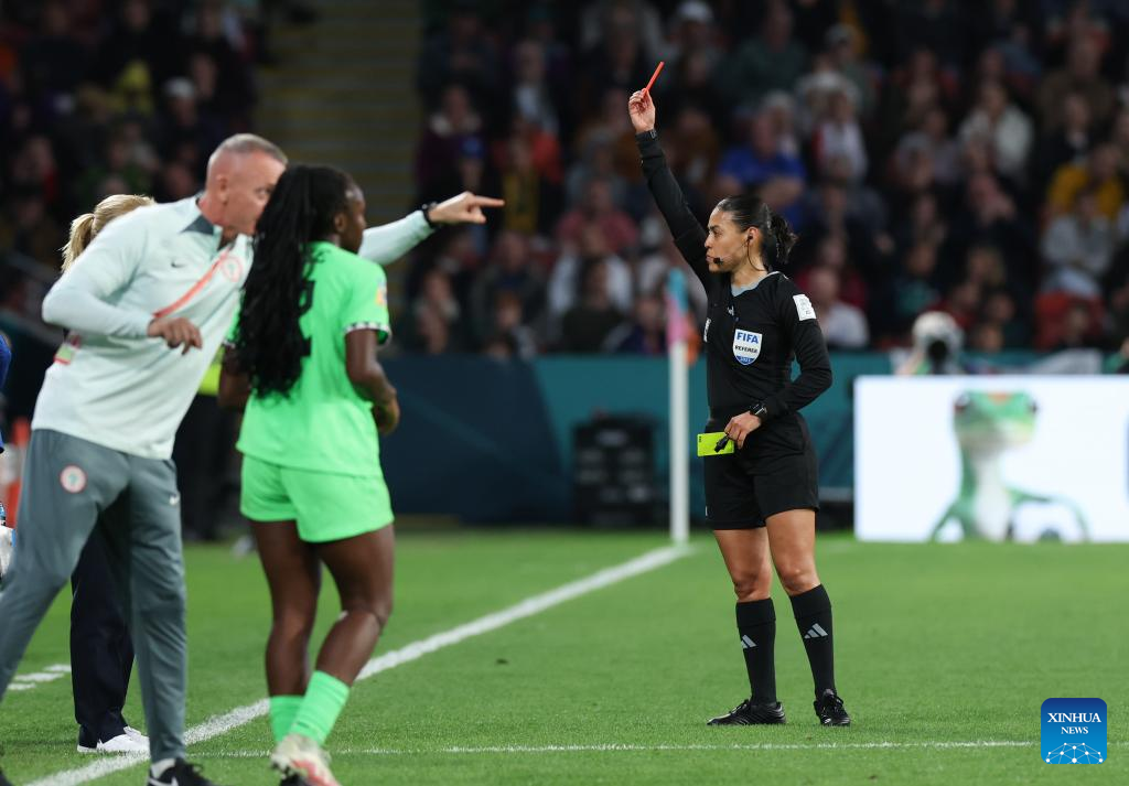 Referee Melissa Borjas (R) gives a red card to England's Lauren James during the round of 16 match between England and Nigeria at the 2023 FIFA Women's World Cup in Brisbane, Australia, Aug. 7, 2023. (Xinhua/Ding Ting)