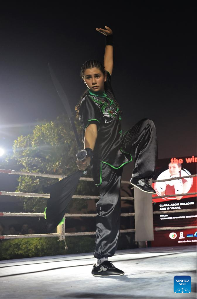 A girl performs a wushu show during a Wushu Sanda competition held in Tabarja, near Beirut, Lebanon, on Aug. 6, 2023. (Xinhua/Liu Zongya)