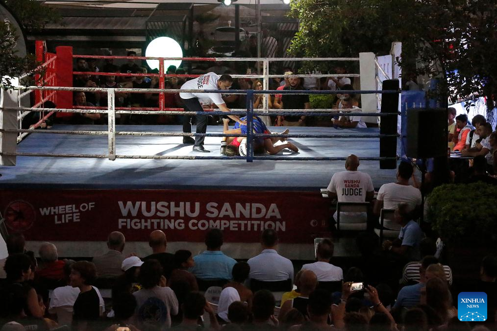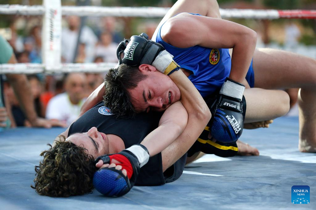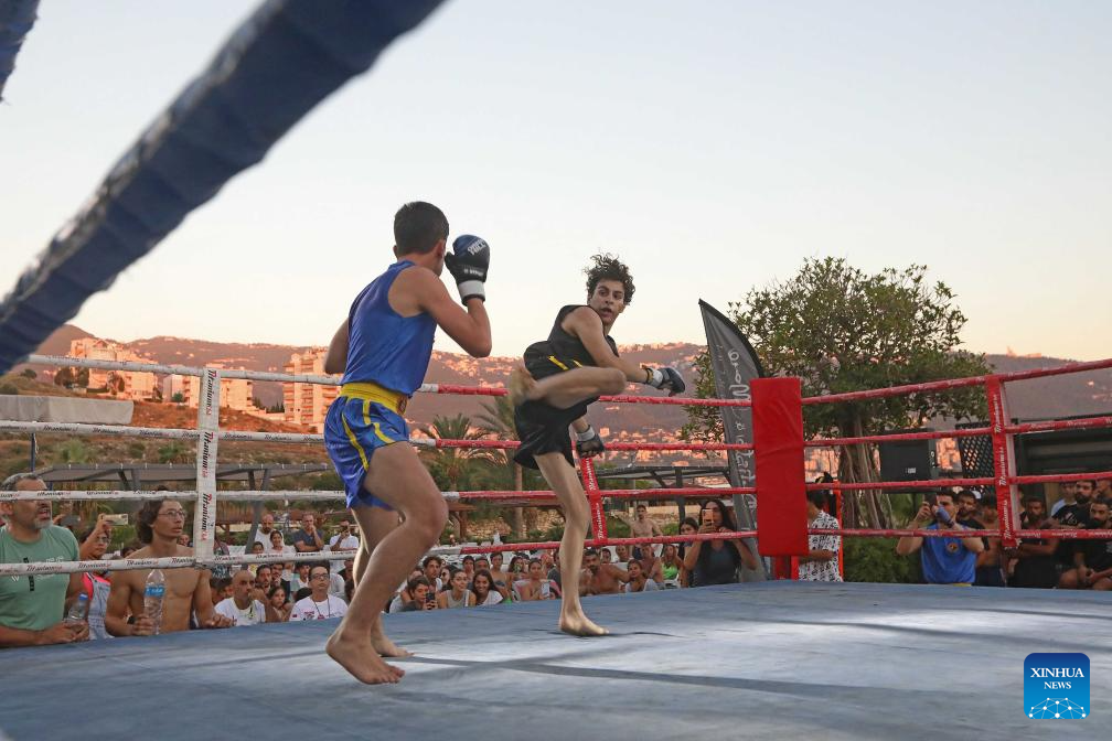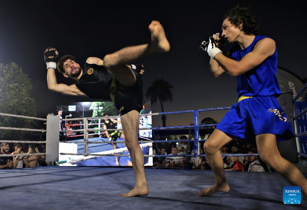 Participants compete in a Wushu Sanda competition held in Tabarja, near Beirut, Lebanon, on Aug. 6, 2023. (Xinhua/Liu Zongya)