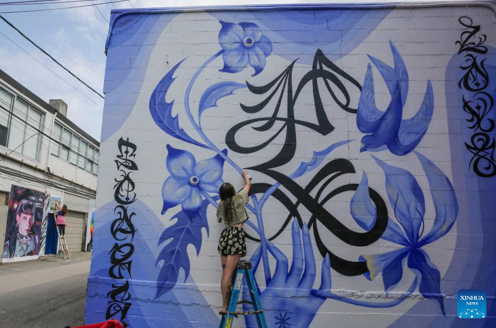 An artist works on her mural during the annual Vancouver Mural Festival in Vancouver, British Columbia, Canada, on Aug. 7, 2023. Mural artists from across the world participated in the annual ten-day festival, turning the urban space into an art gallery. (Photo by Liang Sen/Xinhua)