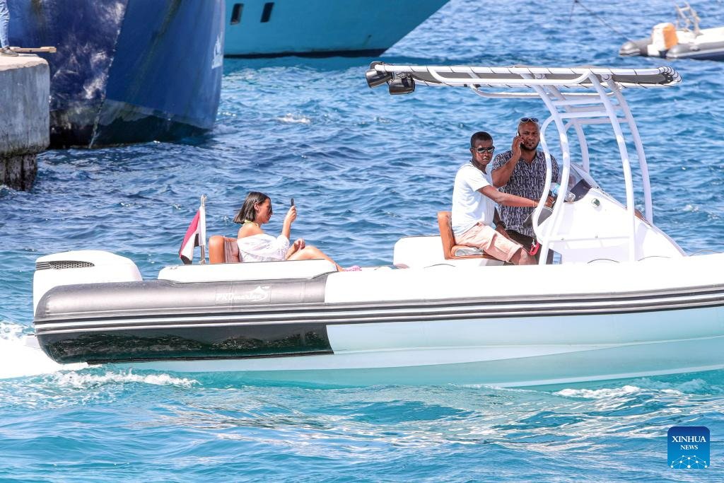 Tourists take a boat on the sea in Hurghada, Egypt, on Aug. 3, 2023. The white sandy beaches of Egypt's Red Sea resort of Hurghada bustle with tourists as the country's tourism sector is witnessing a boom. (Xinhua/Ahmed Gomaa)