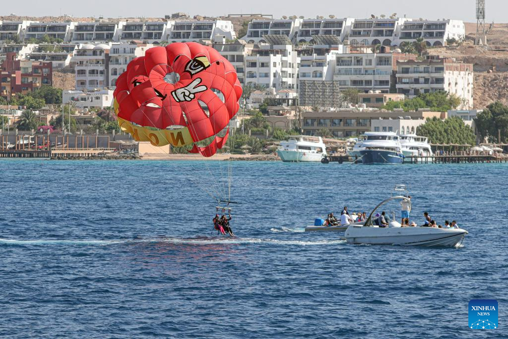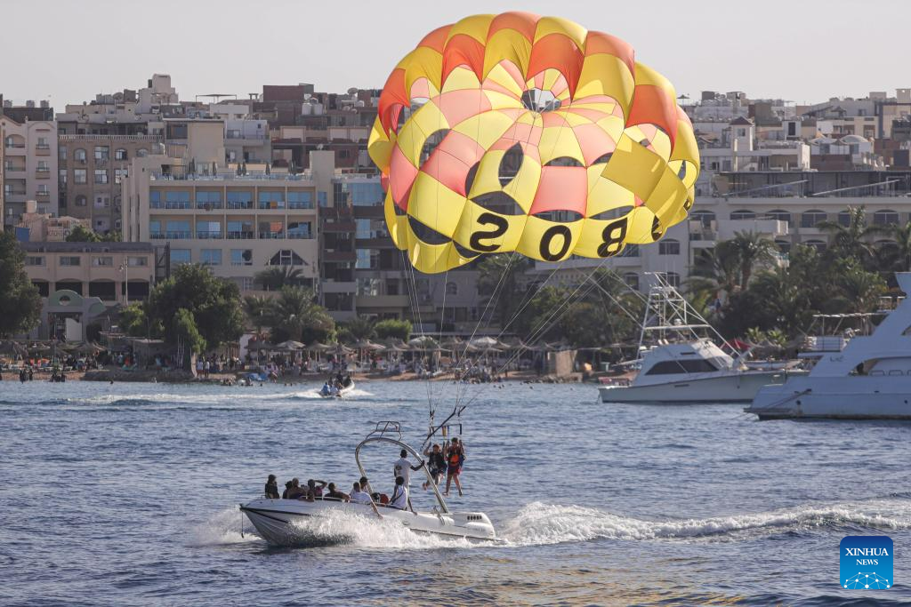Tourists experience sea parachute in Hurghada, Egypt, on Aug. 3, 2023. The white sandy beaches of Egypt's Red Sea resort of Hurghada bustle with tourists as the country's tourism sector is witnessing a boom. (Xinhua/Ahmed Gomaa)