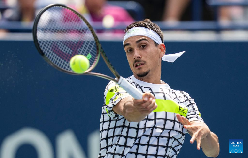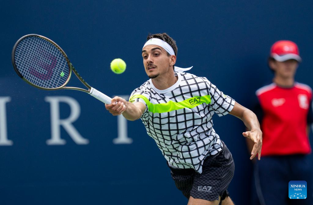 Lorenzo Sonego competes during the men's singles first round match between Andy Murray of Britain and Lorenzo Sonego of Italy at the National Bank Open tennis tournament in Toronto, Canada, on Aug. 8, 2023. (Photo by Zou Zheng/Xinhua)