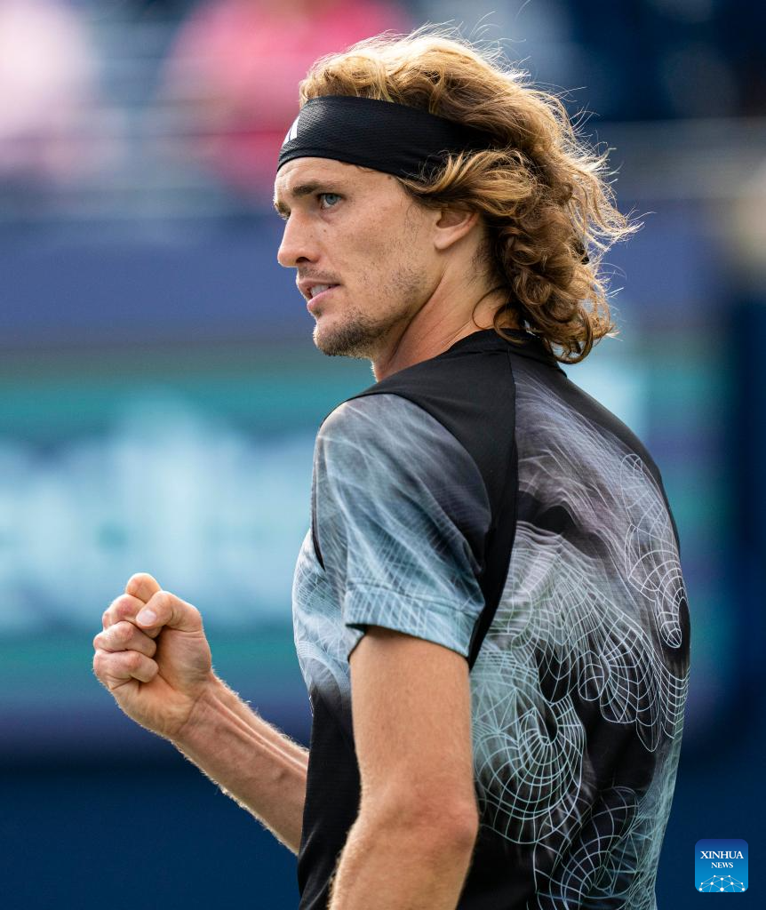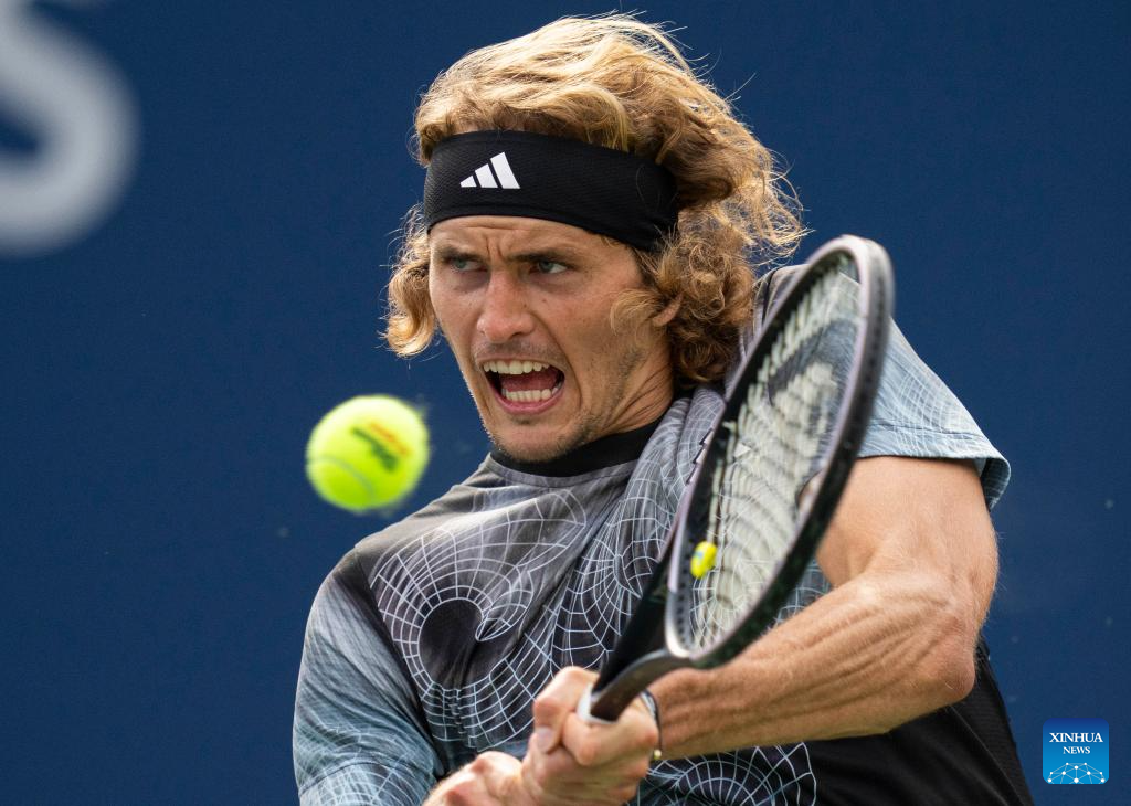 Alexander Zverev competes during the men's singles first round match between Tallon Griekspoor of the Netherlands and Alexander Zverev of Germany at the National Bank Open tennis tournament in Toronto, Canada, on Aug. 8, 2023. (Photo by Zou Zheng/Xinhua)