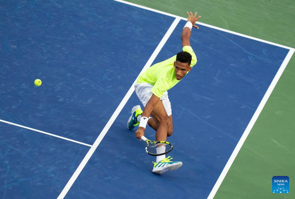 Felix Auger-Aliassime of Canada returns the ball against Max Purcell of Australia during a men's singles first round match at the 2023 National Bank Open in Toronto, Canada, on Aug. 8, 2023. (Photo by Zou Zheng/Xinhua)
